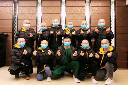 在训练防护服的时候,天使们觉得在脱防护服帽子摘下来这个环节,头发是最容易掉下来污染到面部和口罩。另一方面头发闷在帽子里面容易出汗,而且穿防护服后不到十分钟就满身大汗,作为医务人员都明白,在出汗的情况下最容易孳生病毒和细菌。所以为了安全,也为了更节省时间,她们义无反顾的剃光满头秀发。当她们剃光头发的集体照传回到潮州以后,大多数同行都为之泪目。女为悦己者容,哪个女生不爱美?但为了身上的这份担当,一头秀发落地而撒,她们剪去的是少女的秀发,扛起的是天使的责任,表现的是潮州护理人的家国情怀!