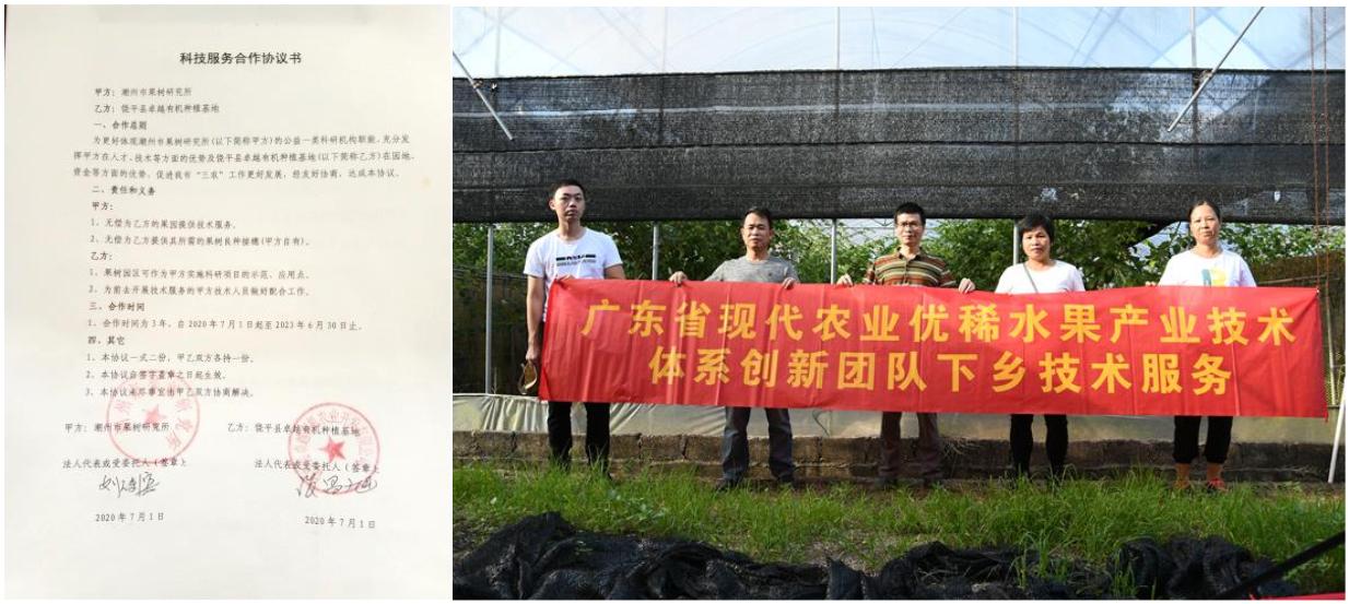 市果树研究所与饶平县卓越有机农业开发有限公司签订了合作协议,同时向该公司推荐了金苹芒、夫人萘及西瓜百香果等适合观光、自采的珍稀水果品种,后期将继续为公司的果树栽培管理提供技术指导,携手推动当地农村产业发展,带动农户增收致富。
