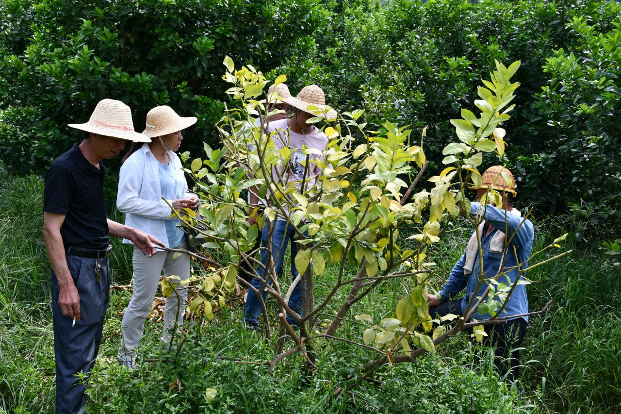 现正值柑橘果实发育和秋梢转绿阶段,不管对今年果实品质还是明年秋梢挂果都极其重要。柑橘团队通过实地观察沃柑、蕉柑、柠檬各园实际情况,就病虫害防治、修剪、施肥等方面与果农进行交流指导。柑橘团队建议,现果实正处于发育阶段,田间观察不能少,应加强锈蜘蛛防治工作以防黑皮果导致果品下降;针对沃柑缺素症状,技术人员为果农分析原因,针对不同砧木采取不同的补充微量元素方法;施肥方面可采用高钾肥,适当补充硼、钙肥,既能养根,又能促进果实发育;根据不同果园秋梢生长情况,技术人员建议秋梢量少的树体要注意防果实日灼,修剪要适当疏剪树冠内部的不挂果枝、徒长枝、过密枝,保持通风透光,矮化树冠。