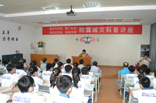 为深入贯彻落实党的十八大提出的实施创新驱动发展战略要求,全面推进《全民科学素质行动计划纲要》的实施,推动全社会普及科学知识、弘扬科学精神、提高全民科学素养,潮州市科协积极组织举办“科技进步活动月”系列科普活动。6月23日下午,市科协联合市地震局、湘桥区科协和太平街道南门社区开展科普进校园活动,在湘桥区城基中学举办防震减灾科普宣传教育活动,向该校师生普及防震减灾知识,提高师生自救互救能力。市科协主席柯泓、市地震局副局长吴泽文、市科协科普部部长王少冲、湘桥区科协主席黄玲丽、湘桥区科协副主席杨慕发、太平街道党工委书记宋琳、城基中学校长方卫玲等参加此次活动。
