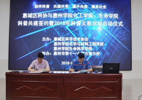 6月12日下午,惠州市惠城区科协与惠州学院化学与材料工程学院、生命科学学院科普共建签约暨2018年科普义教活动启动仪式在惠州市第十一小学方直分校举行。区科协主席刘忠辉、惠州学院化学与材料工程学院党总支书记谢伟强、副院长封科军及生命科学学院副院长周立斌以及区教育局、区文明局有关领导参加了仪式。区科协分别与两个学院签订科普共建协议。
