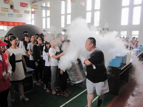 本次科普活动内容有:科学实验秀《神奇的液态氮》,移动球幕影院精彩影片《太阳系之旅》,九连环、拓扑学、透视镜、巧布哨兵、双面绣等挑战科学知识和脑力智力的车载展品、益智展品,灵活多变的机器人表演也获得师生们的阵阵欢声和掌声,同时邀力邀东莞科技馆创意航模表演队前来助阵。表演队带来的航模空中大战、彩色乒乓球雨、飞天猪与愤怒的小鸟等航模表演也给师生们带来了惊喜,让他们近距离充分感受到科学的神奇与魅力。