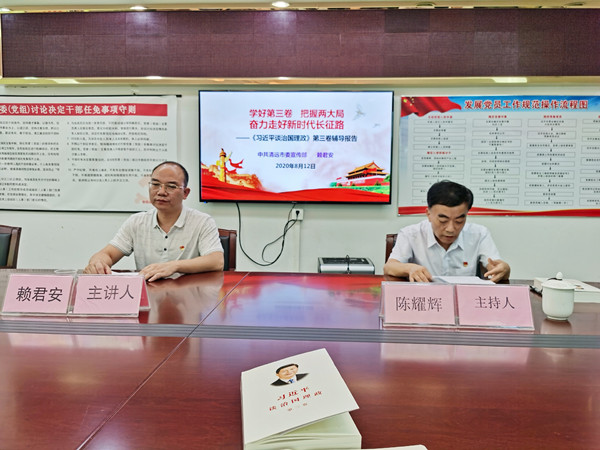 8月12日上午,清远市科学技术协会党组召开理论学习中心组宣讲报告会,专题学习《习近平谈治国理政》第三卷。宣讲报告会由市科协党组书记、主席陈耀辉主持,市委《习近平谈治国理政》第三卷宣讲团成员赖君安围绕“学好第三卷 把握两大局 走好新时代长征路”主题,作《习近平谈治国理政》第三卷宣讲辅导报告。