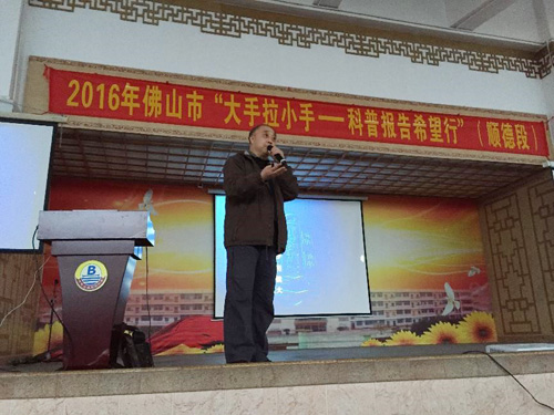 为深入贯彻落实《公民科学素质行动计划纲要》,进一步提升佛山市公民科学素质整体水平,佛山市科学技术协会、顺德区科学技术协会、顺德区伦教街道科学技术协会于3月16日在北海小学举办“2016年佛山市大手拉小手——科普报告希望行(顺德段)”科普知识讲座活动。此次活动,特邀中科院老科学家科普演讲团专家、北京师范大学物理系教授刘大禾为现场一千多名小学生作出教育和指导。