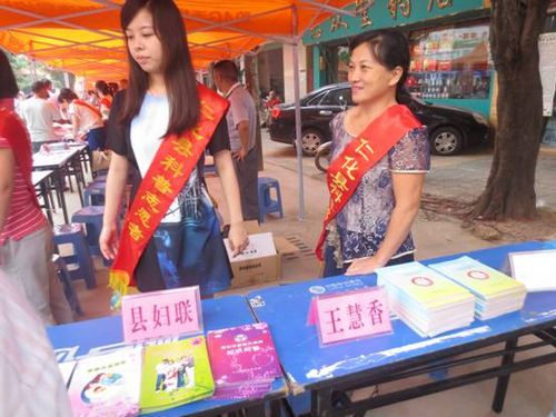 仁化县科协副主席温美莲(左一)在活动中发放抽奖名片