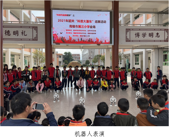 韶关市科技馆带去了VR、能力测试和健康生活等多项车载科普展品和机器人表演。现场派发了食品安全、智慧生活、禁毒等主题的科普宣传资料,现场设置了“2030年前碳达峰行动方案”及食品安全科普展板。通过这些互动体验项目,让同学们体验和共享科普成果,拓宽视野,营造爱科学、学科学、用科学的良好氛围,激发孩子们的创新兴趣,对孩子们树立科学思想、掌握科学方法、增强创新精神和实践能力起到促进作用。
