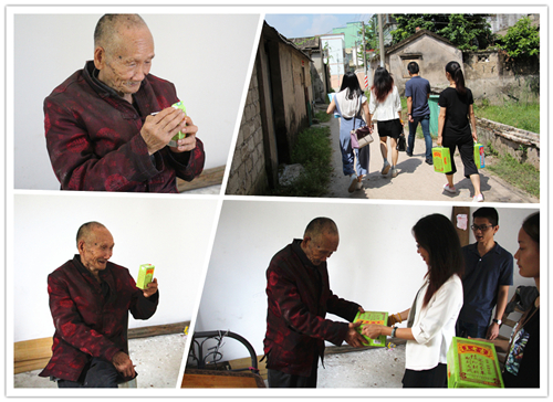 在万石居委书记陈拥艺的陪同下,区科协一行人沿着熟悉的乡村小道来到86岁高龄的陈顺发老人家中。走进陈顺发老人的家里,看到老人家正侧卧着休息,屋里风扇开着,并不觉得酷热。看到来人,老人家十分欣喜,科协主席和万石居委书记立即上前搀扶起老人家。科协主席柯睿打开一瓶王老吉凉茶,双手递给老人家,与老人家亲切地拉起家常,叮嘱老人家天气炎热要多注意休息、多喝水,防暑降温,保重身体。