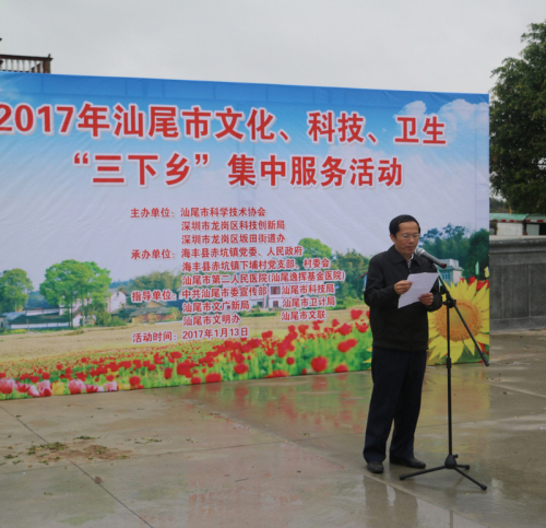 为贯彻落实省委、省政府精准扶贫和汕尾市委、市政府创建文明城市的工作精神,1月13日,汕尾市科协、深圳市龙岗区科创局、深圳市龙岗区坂田街道办在海丰县赤坑镇下埔村联合举办文化、科技、卫生“三下乡”集中服务活动。市科协党组书记、常务副主席范志能作了讲话,市科协专职副主席洪羿主持启动仪式。这次活动得到了市委宣传部等市直有关部门的支持和指导。