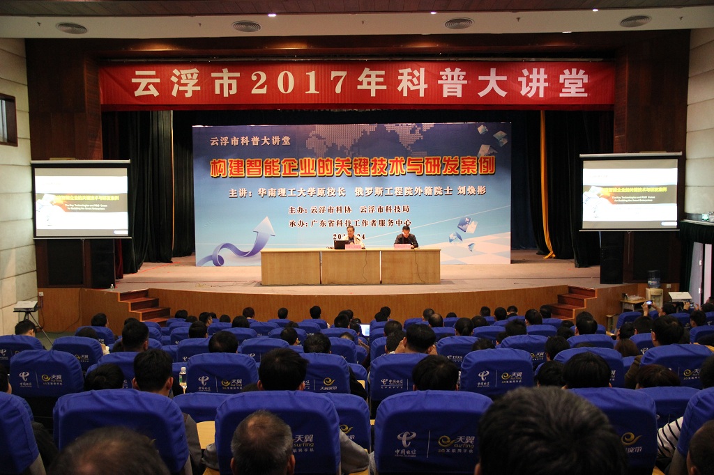 4月12日下午,“云浮市2017年科普大讲堂”在市文化馆举行,刘焕彬院士作《构建智能企业的关键技术与研发案例》专题报告。参加报告会的有市直有关单位负责人、各县(市、区)高新技术企业、高新技术培育入库企业、建有研发机构的企业、规上企业等企业负责人及技术主管共约200人。