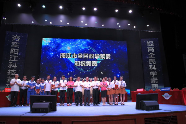 9月13日下午,“全民科学素质知识竞赛”在市区百乐演艺中心隆重举行。经组织发动,全市每个县(市、区)派出一支代表队,共7支代表队参加比赛。本次知识竞赛也得到了社会各界的广泛关注和大力支持,出席比赛现场的有市委宣传部、市科协、阳江广播电视台班子成员、各县区群众代表,全场400个座位座无虚席。各参赛队经过必答题、抢答题、风险题和死亡题四轮紧张而激烈的角逐,阳春市代表队以高分夺冠,高新区代表队获第二名,阳东区代表队获第三名。最后,市科协主席郑辉印、市委宣传部副部长余建华、阳江广播电视台党委副书记、纪委书记林俭玲分别为一、二、三等奖进行颁奖。市直代表队、阳西县代表队、江城区代表队、海陵试验区代表队获优秀组织奖。市科协副主席余中翠为优秀组织奖获奖者颁发获奖证书。