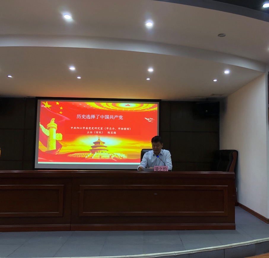 4月20日上午,阳江市科协举行党史学习教育宣讲会,邀请党史学习教育市委宣讲团成员、市委党史研究室主任陈宝德同志作专题宣讲。宣讲会由阳江市科协党组书记梁之灼同志主持,市科协机关、市科技馆全体人员,市级学会会长或秘书长、退休党员共50多人参加。