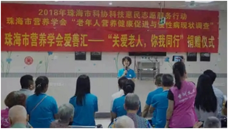 2018年6月9日,珠海市营养学会在香洲区光明街朝晖护老院举行2018学会科技惠民志愿服务行动启动仪式暨“爱善汇——关爱老人,你我同行"捐赠仪式。珠海市科协副主席杨穆出席活动。