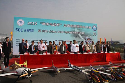 由中国航空运动协会、广东省航空学会、深圳市文体旅游局联合主办的 2010“深南电路杯”全国航模公开赛暨遥控直升机花式3DX-中国区大赛11月7日上午在深圳湾F1赛艇场北岸隆重开幕。广东省科协汤世华副主席、广东省航空学会常务副理事长梅卫民、省科协合作交流部部长郑德胜、省航空学会副理事长国际级裁判叶树均、深圳市模型协会秘书长云中生、深南电路公司副总经理周进群、香港动力模型协会主席陈许幼仪、台湾台北县模型协会会长肖守伦、英国国际3D Master创办人杰夫 白瑞金(jeff barringer)。本次大赛深南电路有限公司承办;协办单位有深圳南山区体育局、深圳市航空航海车辆模型运动协会、深圳市青少年活动中心、香港马斯特市场推广公司、台湾台北县模型协会。