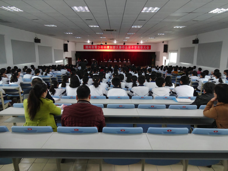 表彰会由市科协主席柯泓主持,市教育局副调研员庄建明代表大赛组委会作《关于2015年潮州市青少年科技创新大赛作品收集及评审工作的报告》,市科技局副局长许敬阳代表大赛组委会宣读《关于表彰2015年潮州市青少年科技创新大赛获奖单位和个人的决定》。各县区科协、教育局、科技局、知识产权局分管青少年科技教育工作的领导和有关部门负责人,市直学校、获奖单位、老师和学生代表以及湘桥区城基实验中学师生400多人参加了本次市青少年科技创新作品展示暨表彰会议。