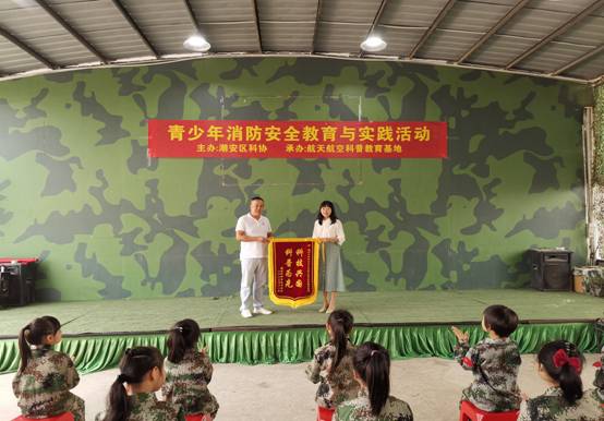 区科协精心准备了一面锦旗赠送给潮安区青少年航空航天科技教育基地,肯定该基地多年来为普及科学知识及提高周边群众的科学文化素质做出的贡献。