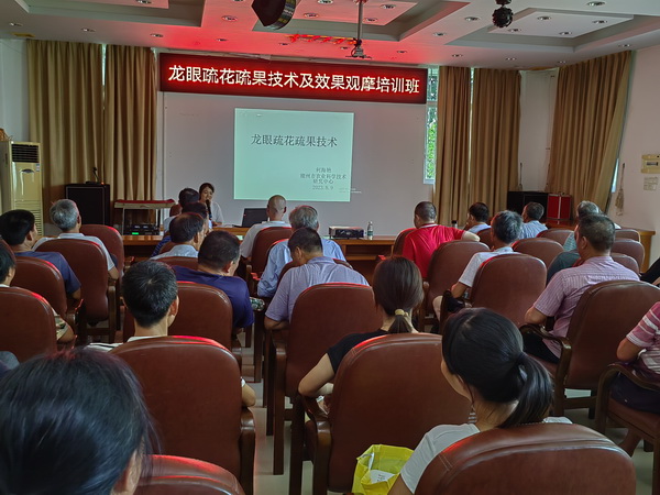 本次活动以组织现场观摩和集中培训形式举行,广东省龙眼产业技术体系创新团队首席专家出席活动。在市农业科学技术研究中心果树研究所的龙眼新品种培育展示园,实地观摩龙眼疏花疏果的效果,并品鉴脆蜜龙眼等新品种。现场由省龙眼产业技术体系创新团队首席专家黄旭明教授、国家荔枝龙眼产业技术体系深圳综合试验站高级农艺师张树飞和市农业科学技术研究中心果树研究所所长、高级农艺师刘朝吉等专家结合相关不同类型的疏花疏果的结果现场,讲解疏花疏果技术关键要点,并就观摩发现的问题进行解惑答疑,帮助农户解决龙眼稳产优质的技术难题。观摩后,在市农业科技研究中心会议厅开展“龙眼疏花疏果技术培训”,何海艳等果树专家结合自身工作实践,对龙眼果树的栽培管理技术作了全面的讲解,并现场互动答疑,切实解决农户在种植管理中遇到的技术问题。活动主办方还为农户发放科普小册子、优质叶面肥,帮助进一步提高果品质量,促进当地龙眼产业高质量发展。