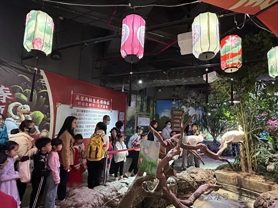在乔木葱郁的“热带雨林”中,亲子家庭身临其境地接触自然、了解自然。他们穿梭于虚实结合的生态造景中,观察龟类、蛙类、鱼类等动物的独特生存方式。科普导师以生动的语言揭示了不同生态系统对地球环境的重要性,孩子们惊叹于自然界的精巧平衡,纷纷记录下“生命共生”的奇妙法则。