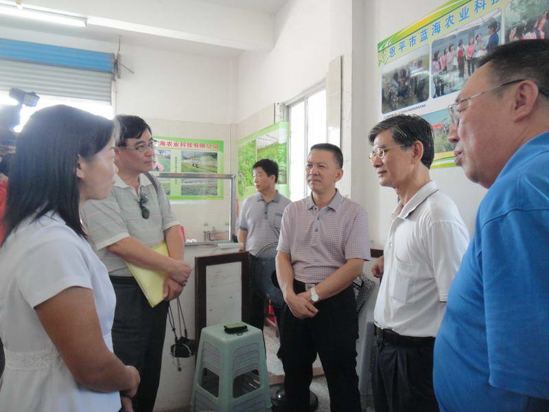 广东省科协为推动科普惠农工作深入开展,总结和推广科普惠农先进经验,在阳江市召开广东省西部地区科普惠农实施工作现场会,在8月7日上午,会议组织省市部分代表来到江门市恩平市蓝海农业科技有限公司参观指导。中国科协农技中心主任张晓军,广东省科协党组成员、副主席吴焕泉,广东省财政厅教科文处副处长饶伟强以及省市科协参加会议的部分代表,在江门市政协副主席、市科协主席赵树培,恩平市副市长李一鸣的陪同下,现场考察全国科普惠农先进个人恩平市蓝海农业科技有限公司总经理黄海燕,她带领当地农民走科技致富之路,2012年被中国科协和财政部评为科普惠农兴村计划农村科普带头人。