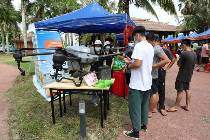 台山市农业农村局组织农业技术推广中心、聚沣农业机械厂、农机协会、优禾农业科技服务有限公司等单位在现场为群众展示农机应用,无人机介入植保统防统治新技术,传授农机安全知识和发放特色产业实用技术手册。