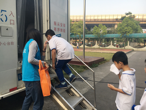体验活动首先由防灾减灾专业讲师的向现场学生教授自救逃生技巧,学生们纷纷跟着讲师举起双手,右手捉住左手手腕,在胸前形成一个三角形,现场学习避险自救姿势。然后,学生们排队进入地震应急大篷车,现场体火灾烟雾逃生环节,模拟在具有刺激性气味的“烟雾”下如何迅速有序的安全撤离。