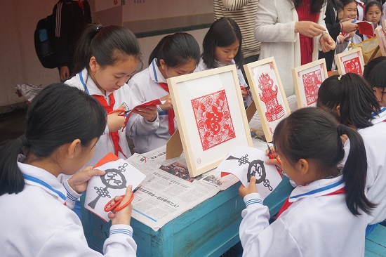 在文化区域,科普灯谜区击鼓声、猜谜声和喝彩声此起彼伏,学生们互相探讨交流起猜谜技巧。在非遗项目剪纸演示体验区,林华老师向学生讲授剪纸历史和技巧,学生们一边全神贯注的听着剪纸大师的讲解,一边聚精会神的进行剪纸体验。两大体验区域,一动一静相得益彰。