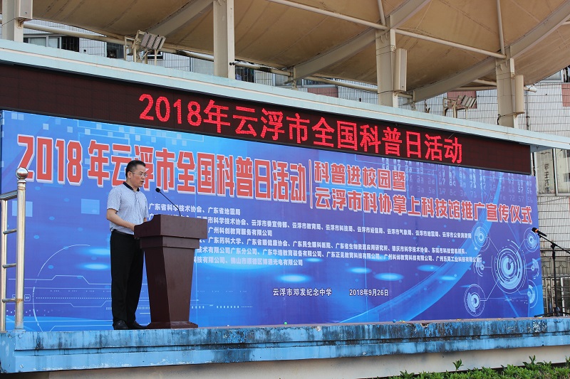 9月26日,云浮市科协联合省科普中心、市委宣传部、市教育局、市科技局、市经信局、市气象局、市地震局、市公安消防局等单位在邓发纪念中学举办2018年云浮市全国科普日活动——科普进校园暨云浮市科协掌上科技馆推广宣传仪式。各主办、承办、协办单位和云浮市全民科学素质工作领导小组成员单位的负责同志,邀请省的科技教育专家、科普志愿者,新闻媒体记者,邓发纪念中学的师生共1500多人出席了活动的启动仪式。