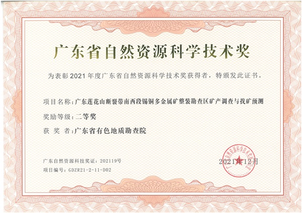 近日,广东省地质学会推荐的由广东省有色金属地质局九三一队、广东省有色地质勘查院共同完成的《广东莲花山断裂带南西段锡铜多金属矿整装勘查区矿产调查与找矿预测》项目获得2021年度广东省自然资源科学技术奖二等奖。