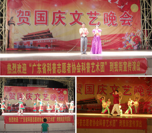 作为2013年广东省“全国科普日”的系列活动之一,广东省科普志愿者协会科普艺术团于于9月15日在广东科学馆举办了“庆祝科普艺术团成立十周年暨贺中秋迎国庆大型科普文艺晚会”后,又马不停蹄地走进基层,走进社区进行广泛的科普文艺宣传活动,并以此发展其基层组织,以科普文艺相融合的形式走到群众中间,让群众喜闻乐见,推动全民科学素质的整体提高。